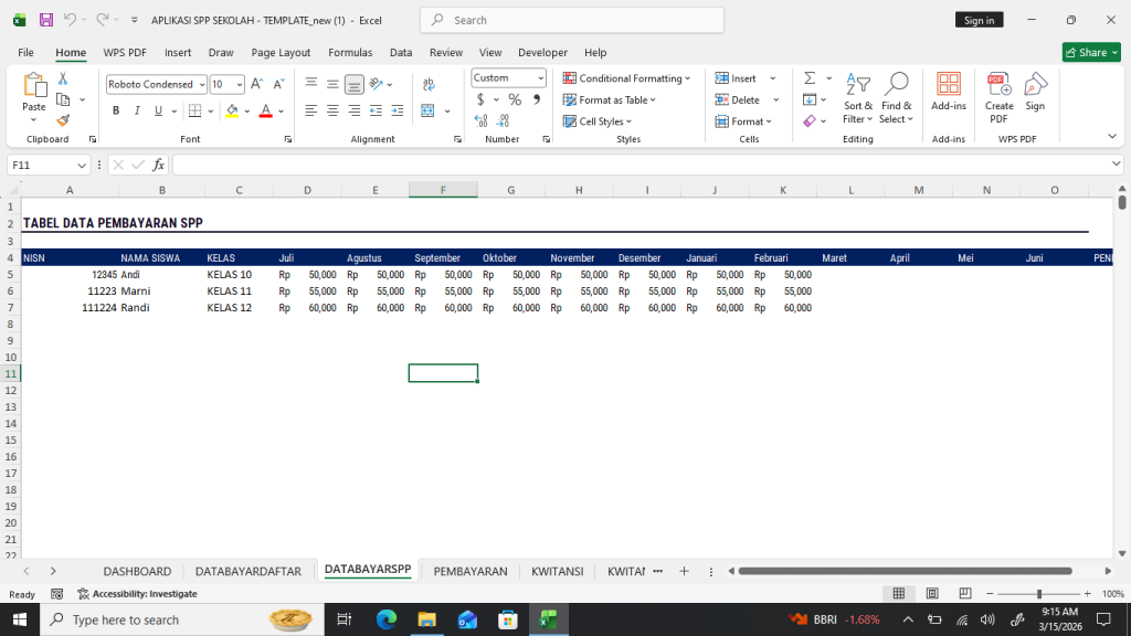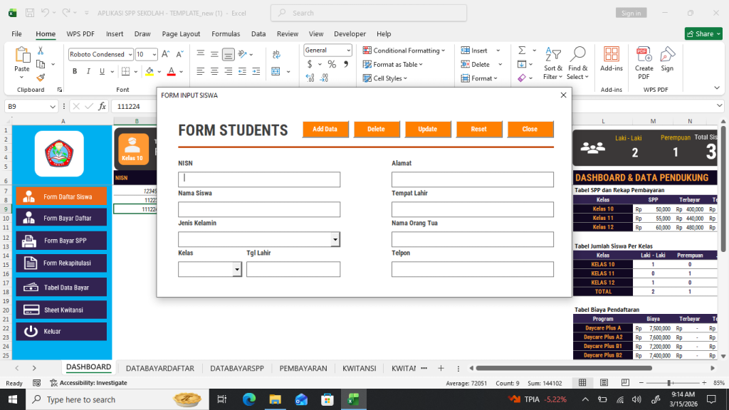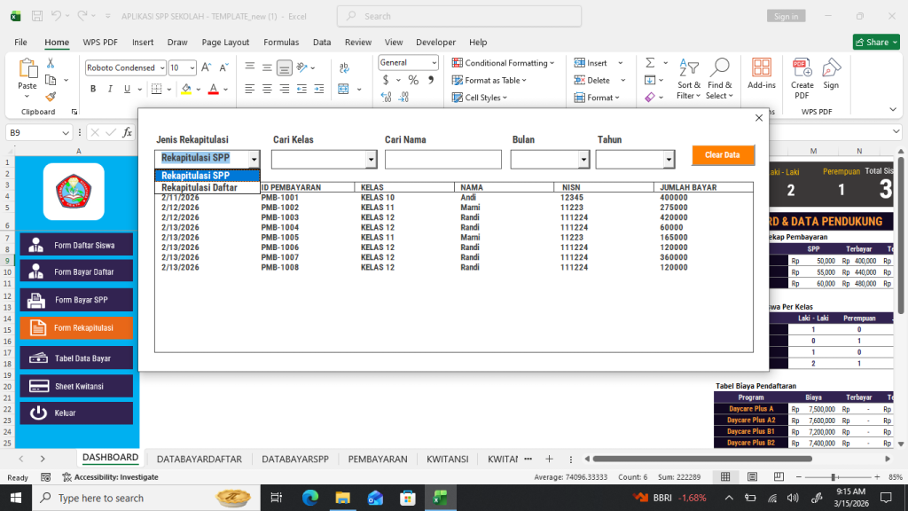 Untuk mengatasi masalah tersebut, kini hadir Aplikasi Pembayaran SPP dan Pendaftaran Sekolah berbasis Excel Macro VBA yang dirancang untuk membantu bendahara sekolah atau bagian administrasi mengelola pembayaran dengan lebih mudah, rapi, dan cepat.