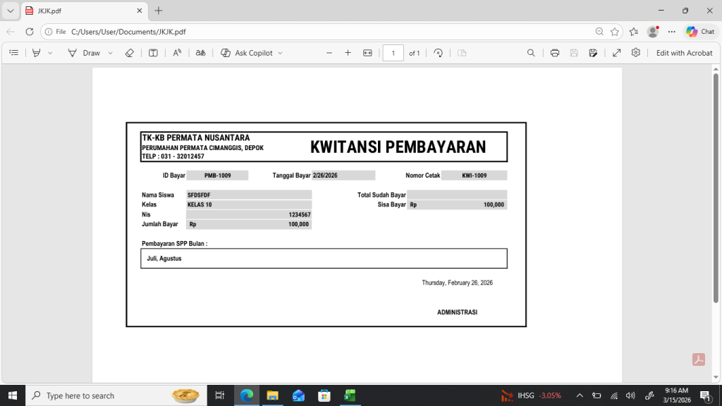 Kwitansi ini dapat langsung diberikan kepada siswa atau wali murid sebagai bukti pembayaran resmi.